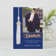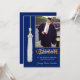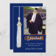 Convite de festa de formatura personalizado azul & laranja. Adicione a data, o nome do formando e a foto à frente deste cartão de graduação e personalize as informações na parte traseira. Cartão desenhado por Rycky Creations; trabalho artístico original de punho branco; rabiscos deliciosos. Entre em contato com o artista para uma carta com as suas próprias cores escolares!