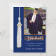 Convite de festa de formatura personalizado azul & laranja. Adicione a data, o nome do formando e a foto à frente deste cartão de graduação e personalize as informações na parte traseira. Cartão desenhado por Rycky Creations; trabalho artístico original de punho branco; rabiscos deliciosos. Entre em contato com o artista para uma carta com as suas próprias cores escolares!