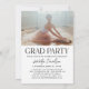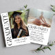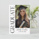 Convites de festa de formatura elegantes e planos apresentam uma foto vertical do formando com o texto "Graduate" moderno e decorativo em preto com serifa e texto que pode ser personalizado com o nome do formando e o ano da turma. O verso do cartão inclui uma segunda foto horizontal, juntamente com uma redação de convite de festa de formatura personalizada que pode ser modificada como desejar. O esquema de cores preto e branco clássico e o design são perfeitos para celebrar a formatura do ensino médio ou da faculdade.