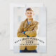 A tipografia moderna torrada é caracterizada nestes anúncio/convite da graduação que mistura o estilo masculino com as linhas limpas contemporâneas e uma sensação do time do colégio. Com seu nome personalizado no texto curvado, e ano da classe e nome todos da escola no preto, a rotulação é ajustada na perspectiva da foto superior vertical do retrato do seu filho em uma banda transparente do branco. Na parte traseira, todo o texto pode ser personalizado. O uso como um convite a uma festa de formatura (como mostrado) ou muda facilmente o texto a um anúncio somente.