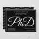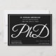 Um convite de festa de formatura de doutorado a preto com texto branco. Este convite também tem um padrão da palavra PhD, em script, atrás.