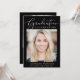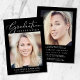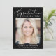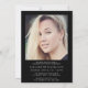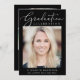 O anúncio da graduação negra e o convite de festas de formando de uma garota elegante, com a "Celebração da Graduação" na moderna escrita branca e na tipografia, sua foto e seu nome, ano escolar e de aula em tipografia branca simples. No verso, adicione outra foto e os detalhes da festa de formatura.