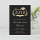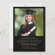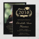 Convite de festa de formatura elegante para faculdade preta com o ano da turma do formando em uma crista de coroa de louros com um chapéu de formatura e diploma, o nome deles em uma letra cursiva formal e a escola, curso, honras ou planos futuros em tipografia serifada clássica. No verso, adicione uma foto e os detalhes da festa de formatura.