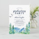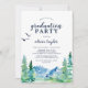 Este convite à festa de formatura Rocky Mountain é perfeito para um evento ao ar livre. O design apresenta uma paisagem de natureza selvagem pintada, azul e verde, com pinheiros de aquarela, pássaros e montanhas.