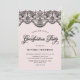 Convite de graduação personalizável com renda de brocade preta em segundo plano de rosa claro. Outras cores e itens correspondentes estão disponíveis.