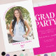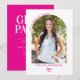 Comemore o último formando com os convidados enviando este Convite para Festas de formatura Rosa Foto do Arch Moderno Fuchsia. Simples e divertido com texto rosa quente lavanda na frente e sólido na parte traseira com texto branco na parte traseira faz este convite na moda e giro. A foto do formando na frente, em forma de arco moderno, com texto elegante e curvado acenando para a família e amigos 'O Vamos celebra o Formando' enquanto o verso tem detalhes do convite de festas. Retrorótipos modernos e belos são associados a um sotaque de caligrafia moderna para a tipografia "Classe de" por interesse visual com uma reviravolta moderna.