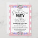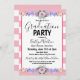 Um adorável convite de festa de formatura com rosas rosa e listras cor-de-rosa.