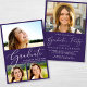 Um convite à festa de formatura roxo moderno, com uma colagem de 3 fotos do formando sobrecarregado com "Formando" em uma elegante escrita branca, e seu nome, ano de aula e escola em letras brancas limpas. No verso, adicione uma foto adicional e personalize os detalhes do seu partido.