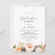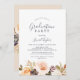 Este convite para festas de formatura florais é perfeito para uma festa ao ar livre. O elegante design de tons de terra apresenta flores de aquarela rústicas em terracota, cobre, laranja queimado, pêssego, rosa esbranquiçado e branco creme com estilo vintage boho.