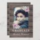 Convites russos para festas de formatura de campo com fundo de celeiro de madeira rústico, uma foto do formando, uma exibição de canto suculenta e um modelo de texto de formando moderno.