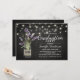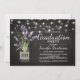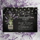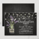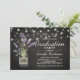 Celebre seu graduado com um estilo country chic descomplicado com este convite de formatura rústico e elegante. Com um fundo de quadro-negro preto, o design é acentuado com luzes cintilantes e um charmoso jarro de mason repleto de flores de lavanda roxas, envolto em burlap para um toque aconchegante e inspirado em uma casa de fazenda.