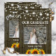 Bonito girassóis, madeiras de celeiro rústico e luzes brancas moles, cintilantes, com uma fotografia do formando, e uma redação moderna de cor branca.