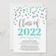 cartão com fotos personalizado de convite à festa de formatura de 2022 em glamouroso turquesa azul-lacrimejo e prata-confetti e texto moderno com letra de mão.