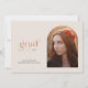 Este anúncio de graduação moderno apresenta a tipografia de tendências e uma foto em forma de arco. Na frente, a palavra "formando" é escrita em um tipo único com o ano de graduação abaixo. Na parte inferior, adicione o nome do formando e a escola. A tipografia é laranja e cinza escura contra um fundo creme. À direita da tipografia, aparece uma foto em forma de arco. Na parte de trás, há uma modelo para os detalhes da festa de formatura.