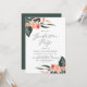 Elegantes convites tropicais de festa de formatura floral que incluem buquês de flores corais aquáticas e folhas verdes e escuras tropicais nos cantos do design. Personalize os convites para festas de formatura florais tropicais com o nome do formando e detalhes da festa. O convite é perfeito para a praia e festas de formatura de temas tropicais para formandos segundos graus e universitárias.