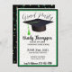 O convite para a graduação moderna apresenta uma inclinação verde no boné de formatura preto e é cortado em faixas pretas e verdes com brilho dourado e fundo branco. A parte de trás do convite é preto com o confete dourado e folha verde e há detentores de lugar para duas das suas fotos favoritas do formando serem. As fotos são aparadas em um quadro verde. Esses convites de festas são perfeitos para os formandos cujas cores escolares são verdes ou verdes e pretas. Outras cores disponíveis em nosso compro.