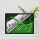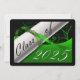 Cartão de graduação verde e preto com diploma e ano de graduação. O fundo é um fundo preto com letras verdes para os convites para festas de formatura.