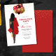 Convite à Festa de formatura de mulheres afro-americanas. Festa de formatura Convidar retrato feminino desenhando vestido preto, boné vermelho e vestido, cabelo escuro longo. Design de balão de folha falsa.