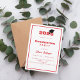 Um convite moderno e na moda para uma festa de formatura. Para ele e para ela. Fundo branco, texto vermelho e um quadro. Um boné de formatura preto.