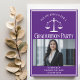 Este convite de festa de formatura de uma escola de direito roxo personalizado apresenta tipografia branca para uma classe de formando 2024 acima da sua foto de estudante. Personalize com o seu ano de graduação, sob as escalas de justiça e fotografia, para um advogado personalizado ou um convite a advogado excelente.