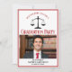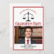 Este convite clássico de festa de formatura de direito vermelho e preto mostra tipografia clássica para uma classe de formando 2025 acima da foto de seu aluno. Personalize com o seu ano de graduação, sob as escalas de justiça e fotografia, para um advogado personalizado ou um convite a advogado excelente.
