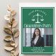 Este convite de festa de formatura da escola de direito verde personalizado apresenta tipografia branca para uma classe de formando 2024 acima da sua foto de estudante. Personalize com o seu ano de graduação, sob as escalas de justiça e fotografia, para um advogado personalizado ou um convite a advogado excelente.