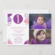 Convite de aniversário de design roxo e rosa adorável para o primeiro aniversário da sua menina. Convide seus amigos e família para comemorar o aniversário de sua filha com este belo convite para design fotografar apresentando uma foto do seu filho como bebê e uma foto recente de um ano. Personalize os primeiros convites de festas de aniversários dessa garota com os detalhes da sua festa.