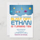 Divirta-se com este convite de aniversário com tema espacial, com um fundo de galáxia cósmica com estrelas e planetas. Perfeito para crianças que amam foguetes, astronautas, e todas as coisas no espaço, este convite dá o tom para uma celebração fora do mundo. Totalmente personalizável com os detalhes do seu partido para torná-lo exclusivamente seu.