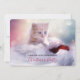 Um convite de festas de Natal com uma fotografia de um gatinho gengibre sentado sobre um chapéu branco e vermelho de Papai Noel. Luzes brilhantes turvas nos fundos.