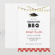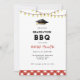 Convite de festa de graduação divertida e rústica com churrasco com ilustração em aquarela de chapéu de graduação e luzes de corda com xadrez gingham vermelho e branco na parte inferior.