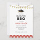 Convite de festa de churrasco de graduação divertido e rústico com ilustração de aquarela de boina de graduação e luzes de corda com xadrez gingham vermelho e branco na parte inferior.