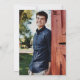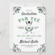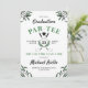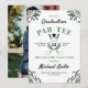 Um convite de festa de graduação tema golfe em branco e verde com folhagens e uma bola de golfe e tacos de golfe cruzados. Adicione uma foto do graduado no verso.