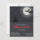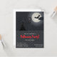 Convite para festa de Halloween. A design mostra uma aranha em uma teia de aranha e atrás dela um castelo assustador, uma grande lua brilhante e uma parede de tijolos segurando todos os detalhes para sua festa de Halloween. Ninguém dirá "Não" a uma festa de Halloween com um convite como este.