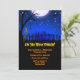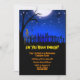 Um esqueleto de morto caminhando parado perto do nariz de um enforcador em um quintal com lua de cheio e fundo azul escuro do céu. Design muito divertido e assustador para seus convites para festas de Halloween.