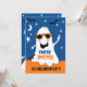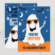 Fantasma adorável com óculos num céu azul noturno com estrelas e morcegos. Convite duplo com texto personalizado.