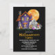 Convide os seus amigos e entes queridos neste Halloween com esta casa roxa e colorida assombrada numa noite à lua com uma pedra de pedra no convite de festas do jardim.