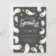 Um cartão de modelo de convite para festas modernas e caprichosas de halloween, com um texto tipográfico escrito à mão no meio que diz "Vamos fica assustado". Ilustração de fantasmas bonitos com estrelas.