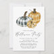 Convites para festas do Dia das Bruxas com abóboras de xadrez em tons de preto, cinza, branco, laranja e creme. "Festa de Halloween" aparece no topo em um roteiro elegante de caligrafia, com seus detalhes personalizados abaixo em simples letras negras. Este design acolhedor, inspirado em fazendas mistura encanto rústico com festivo halloween, fazer perfeito para as reuniões de outono e festas de época assustadora.