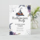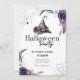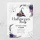 Junte-se a nós para uma festa de Halloween que é encantadoramente elegante! Este belo e único convite combina perfeitamente a diversão assustadora com o sofisticado estilo floral. A design apresenta um chapéu clássico de bruxa no seu centro, rodeado por belos buquês de aquarelas de flores roxas e brancas. As teias de aranha delicadas e uma aranha balançante acrescentam o toque perfeito do espírito de Halloween. Com sua mistura de fontes clássicas de serifa e script moderno, este convite é ideal para uma festa de fantasia de na moda, uma "noite de bruxas", ou qualquer encontro de Halloween que exija um toque de classe.