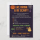Torne a sua besta de Halloween inesquecível com este convite de festas de Halloween de dois lados. Apresentando um título ousado "Coma, Beba e Seja Assustador", brilhantes jack-o-lanternas, caldeiros, morcegos e fantasmas, este convite é perfeito para dar o tom a uma noite de diversão assustadora.