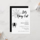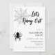 Este moderno convite a preto e branco apresenta "vamos enforcado" escrito em script e uma aranha pendurada em sua teia.