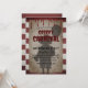 Este convite personalizado do Halloween traz um tema assustador de carnaval. Uma sombra sinistra de um palhaço assustador segurando um balão é impressa através do centro. Um poster de carnaval de papel de pergaminho de estilo vintage é apresentado em segundo plano, sobre um padrão listrado vermelho e branco. O sangue está pingando na parte superior.