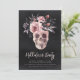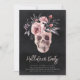 Um convite para festas de Dia das Bruxas, chique assustadora, com uma ilustração do crânio floral, tocado com flores cor d'água rosa e roxa num fundo preto enfumaçado. Personalize este convite exclusivo e elegante da festa do Dia das Bruxas com os detalhes do seu evento em letras brancas.