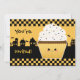 Um cupcake de chocolate kawaii com glacé de xadrez creme e salsichas pretas e laranja E um convite para uma festa de Dia das Bruxas Você pode mudar qualquer coisa no convite que quiser