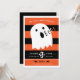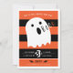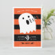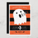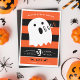 Um convite de festa bonitinho do Dia das Bruxas que não assustará os pequenos. Laranja e faixa negra com um pequeno fantasma bebê dizendo "Booo". Layout de texto simples com espaço para mais informações na parte traseira, se necessário.