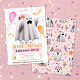 Este design do "Spooktacular Kids Halloween Party" apresenta um giro fantasma dançante e morcegos cor-de-rosa e laranja com balões e estrelas. Você pode personalizar todo o texto para se adequar ao seu evento. Na parte de trás da design há um padrão de fantasmas, florais, luas sobre fundo rosa. Veja toda a coleção correspondente. Todo trabalho de arte é ilustrado manualmente em um estilo aquarela e direitos autorais protegidos por Kaitlyn Thomas.