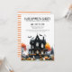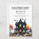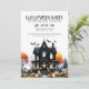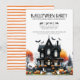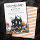 Convide convidados para uma festa de fantasias de Halloween com este convite de festa divertido e simples. Um visual simples preto e branco geral que tem uma mistura de tipografia de fontes ornamentais e serifa. Na parte inferior há uma casa assombrada preta com explosões de cor laranja de abóboras laranja, lanternas de abóbora e árvores. Alguns fantasmas e morcegos fofos apenas completam este visual divertido. A fonte tem um toque de grunge ou aspecto desgastado para um visual vintage antigo. No verso há um padrão de listras laranja e branco, mas você pode realmente mudar este visual alterando a cor do fundo ou a cor da própria listra (ou ambos!). Convite de festa de Halloween adulto elegante com casa assombrada preta, branca e laranja, fantasmas, morcegos e listras.