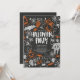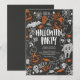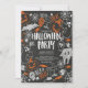O convite divertido para as crianças de halloween, que inclui uma casa assombrada, casa, morcego, crânio, teia de aranha, feitiçaria e jack O, em branco e laranja, sobre fundo preto no quadro.