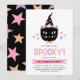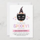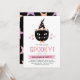 Este convite de festa de Halloween super fofo apresenta um gato preto desenhado à mão, usando um chapéu de bruxa e gravata borboleta. Além do preto, outras cores incluem roxo pastel, rosa e pêssego. O texto diz, "É hora de ficar ASSUSTADOR!" em uma fonte moderna e multicolorida! O verso do cartão contém estrelas rosa, roxas e pêssego sobre um fundo preto.