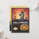 O Convite para o Festa de Halloween inclui um cemitério de estilo vintage com design de bruxo e abóbora. Ilustração do estilo de colheita de morcegos, feiticeiros, abóbora e pedras. Personalize os detalhes na parte traseira da placa para espalhar a palavra sobre seu evento assustador! Navegue na Coleção de Convites de Festas de Halloween para obter mais designs.